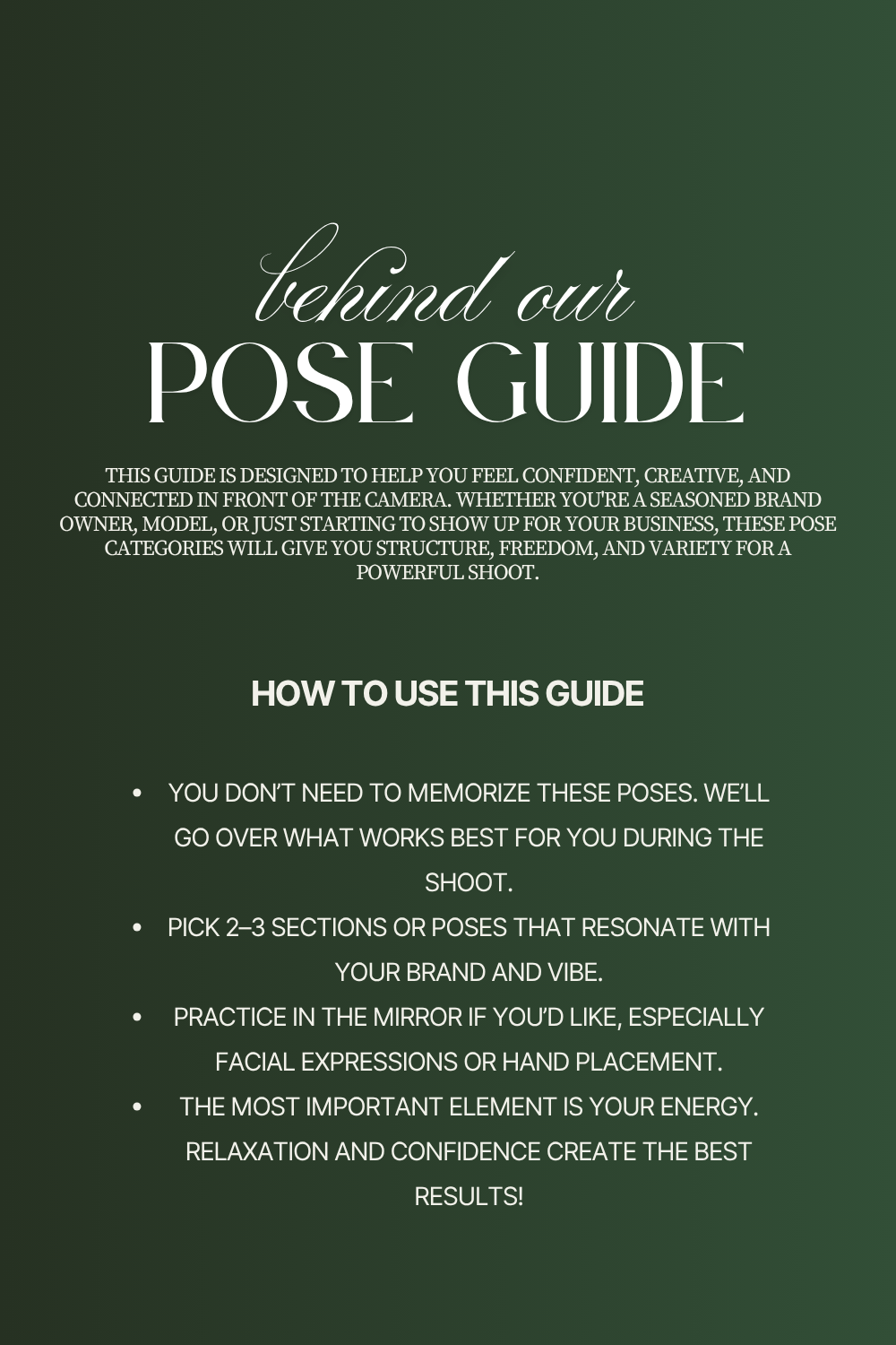 This 16 page digital pose guide is designed to help entrepreneurs, creatives, and small business owners show up with confidence and purpose in front of the camera. Whether you’re new to branding shoots or looking to level up your on-camera presence, this guide gives you a clear breakdown of foundational and advanced poses with real world examples, easy-to-follow instructions, and expert tips from brand photographer Azariah Michelle.